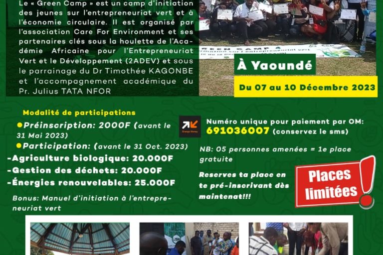 C’est un Camp national d’initiation des jeunes à l’Entrepreneuriat Vert, initié depuis 2019 par l’association Care For Environment à travers l’académie africaine pour le Développement et l’Entrepreneuriat Vert. Il est parrainé par le Dr Kagonbe Timothée, point Focal Changement Climatique au Cameroun et membre du GIEC, par ailleurs responsable du groupe de travail sur la…